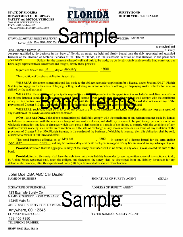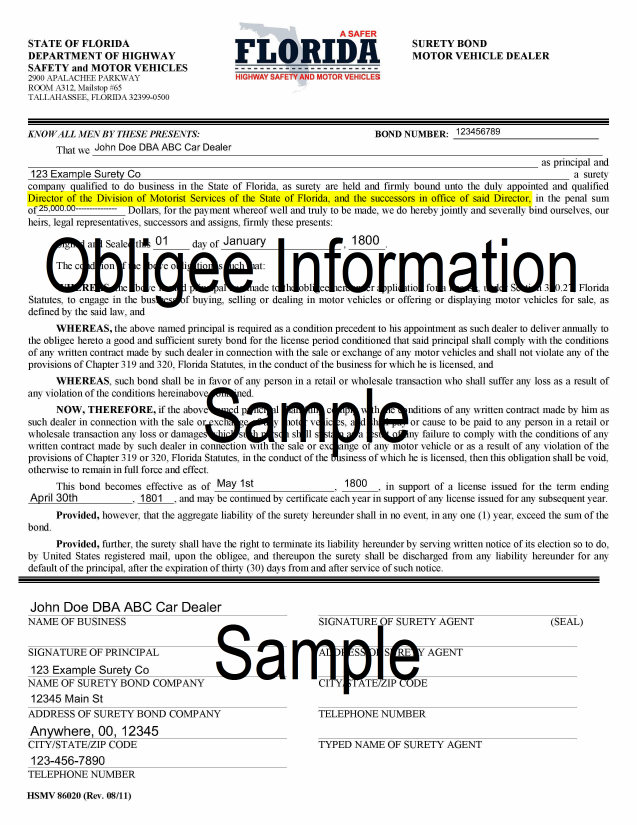 Below is a Florida Motor vehicle dealer bond form. Most bonds follow a basic format.  The Florida Dealer surety bond is good example to show what is actually getting issued. Once the bond is typed and signed and sealed by the Surety it is sent to the Principal to be signed, then the Principal sends the bond to the Obligee.
